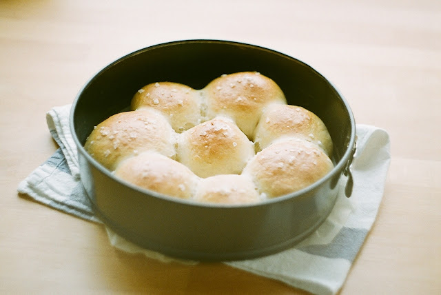 Mąkę mieszamy z drożdżami, solą i cukrem. Stopniowo wlewamy wodę, olej, dodajemy jogurt, wyrabiamy gładkie i elastyczne ciasto. Miskę z ciastem przykrywamy ściereczką i odstawiamy w ciepłe miejsce do podwojenia objętości, po tym czasie ciasto dzielimy na 8 części, formujemy okrągłe bułeczki, układamy je w tortownicy wyłożonej papierem do pieczenia, odstawiamy do napuszenia. Po ok 40 minutach, wierzch smarujemy mlekiem, obsypujemy solą w płatkach lub innymi ulubionymi dodatkami. Piekarnik nagrzewamy do 200 stopni, bułki pieczemy przez ok. 20 minut.